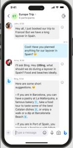 想像一下,當您與朋友和家人保持聯繫併計劃下一次聚會時,有一個副駕駛。只需將必應添加到組中,就像添加任何 Skype 聯繫人一樣,現在您可以讓必應回答問題並為整個組提供信息。例如,如果您的家人正在談論下一次家庭團聚,您可以簡單地向 Bing 詢問有關旅行目的地的建議、預計的天氣預報和您旅行期間的有趣事件,聊天中的每個人都可以訪問這些結果。當您與朋友聊天時,您可以讓 Bing 簡單地從網絡上獲取信息,例如,最新消息或昨晚的頒獎典禮,以添加到您的對話中。
