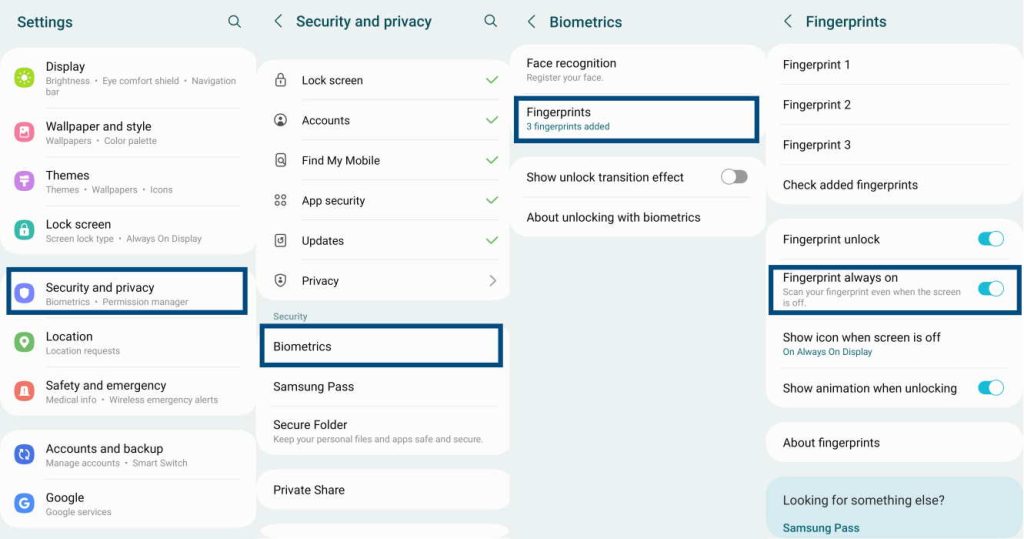 轉到設置 » 安全和隱私。在安全和隱私屏幕上,向下滾動並點擊生物識別。接下來在生物識別屏幕上,點擊指紋。在要求時提供您的 PIN、密碼或圖案。在指紋屏幕上,點擊指紋始終開啟。這將確保手機即使在屏幕關閉時也能掃描您的指紋。