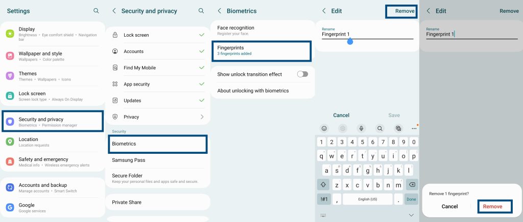 轉到設置 » 安全和隱私。在安全和隱私屏幕上,向下滾動並點按 >生物識別。接下來在生物識別屏幕上,點擊指紋。在要求時提供您的 PIN、密碼或圖案。點擊您註冊的指紋進行編輯它。在編輯屏幕上,點擊右上角的刪除按鈕。再次點擊刪除進行確認。