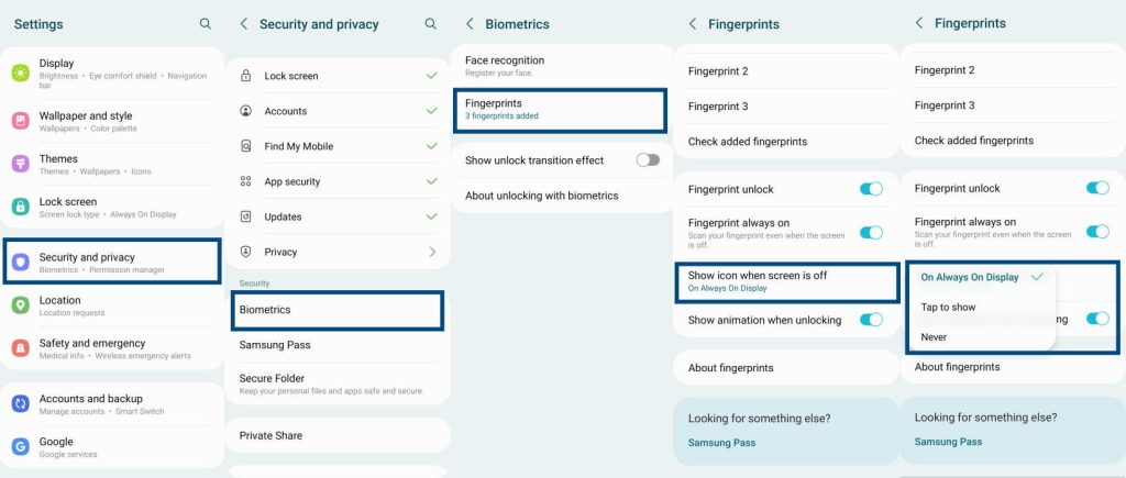 轉到設置 » 安全和隱私。在安全和隱私屏幕上,向下滾動並點按生物識別。接下來在生物識別屏幕上,點擊指紋。在要求時提供您的 PIN、密碼或圖案。在指紋屏幕上,點擊屏幕關閉時顯示圖標。從下拉列表中選擇始終顯示或點擊顯示。