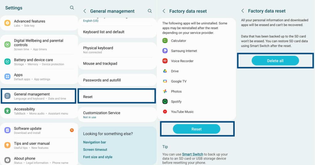轉到設置 » 常規管理 » 重置。點擊恢復出廠設置,然後點擊重置如果要求,請提供PIN、密碼或圖案。點擊全部刪除。