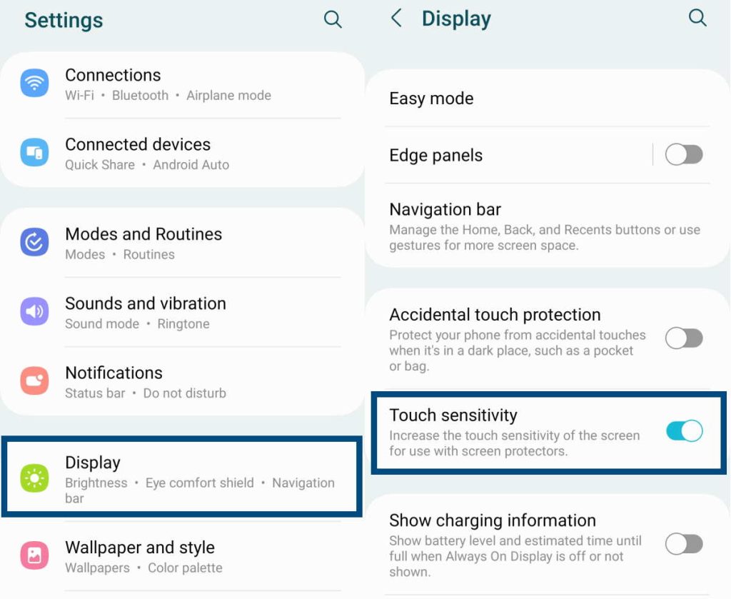 點擊 設置應用,然後找到並點擊顯示。在顯示屏幕上,找到觸摸靈敏度選項並點擊旁邊的撥動開關將其打開。