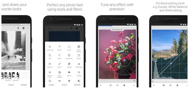 Snapseed 是一款由 Google 開發的照片編輯應用程序,你不會不喜歡這個應用程序,但你會更喜歡它,因為它的功能和事實上,它是免費的並且沒有廣告,這與我列出的其他照片編輯器應用程序不同。 Snapseed 有一些最先進的免費照片編輯工具,您可以將您的照片變成工作室的藝術品,它有不同的濾鏡和畫筆,可以清除照片上的傷痕。