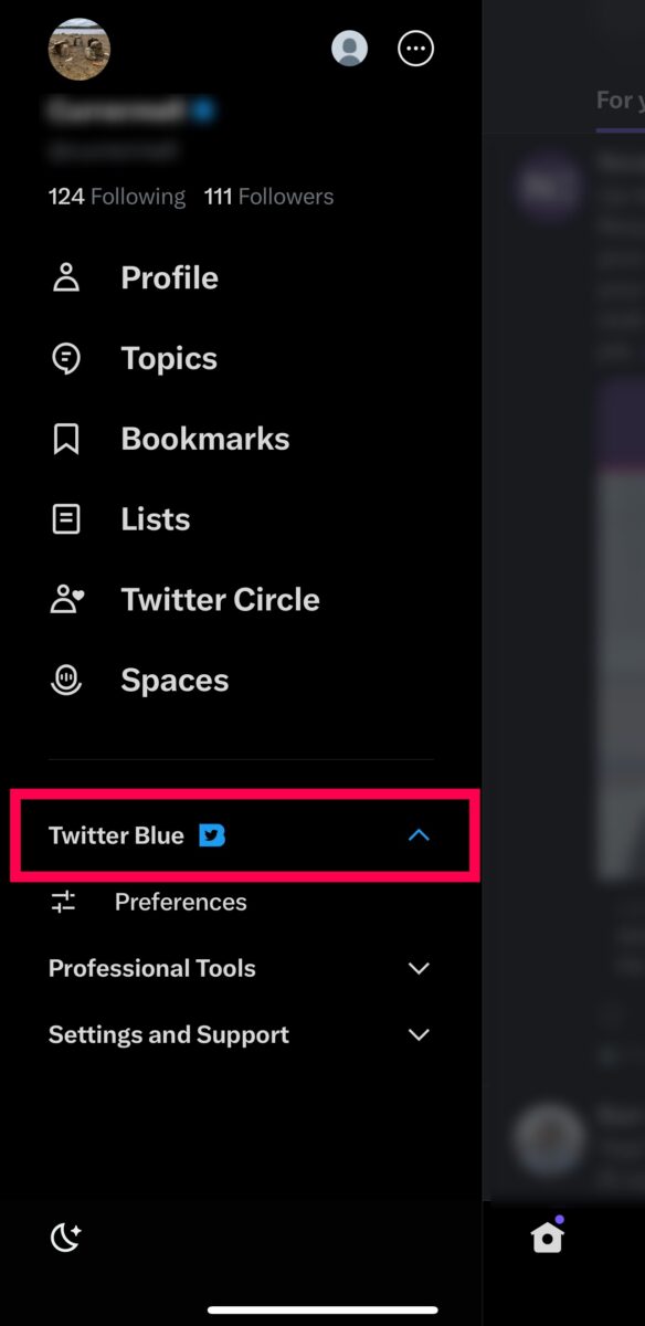 您可以選擇Twitter Blue 或設置和支持 來更改設置。
