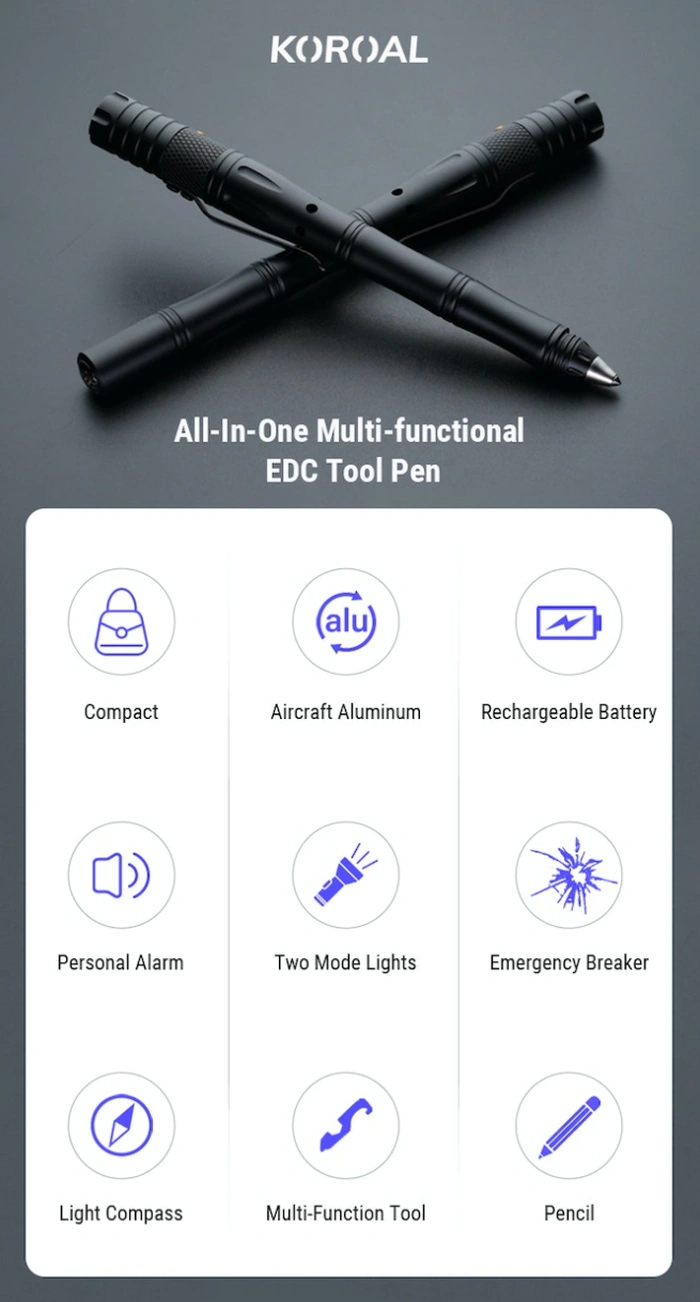 “KOROAL 是最好的 EDC 小工具,可以為任何事情做好準備,並為您的日常生活提供便利。它不僅具有書寫功能,還加強了應急救援功能,如:手電筒、報警器和玻璃破碎器。但它也是一支書寫流暢的筆,或者可移動的多功能工具可以為你做。”