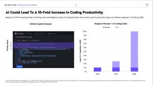 在 Ark Invest 最近發布的“Big Ideas 2023”報告中,投資管理公司預測 AI可以使編碼效率提高 10 倍。基於交易成本和反饋循環每年下降 70%,像 Copilot 這樣的 AI 編碼助手可以提高軟件工程師的產出 10-到 2023 年翻倍。