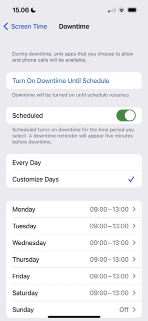 要使用停機時間,您需要打開“屏幕使用時間”。這樣做之後,轉到屏幕時間 > 停機時間。在這裡,您可以自定義是希望該功能每天都出現還是只在某些特定的時間出現。