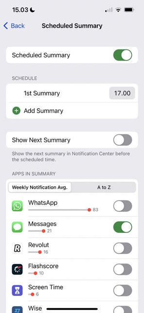 在 Schedule 部分下,您可以添加新的摘要。在摘要中的應用下,您可以選擇要在摘要中接收哪些通知。