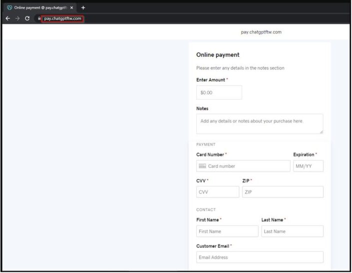 Cyble 甚至遇到了一個虛假的支付門戶網站,據稱該門戶網站會接受付款以升級到 ChatGPT Plus。這是它的樣子: