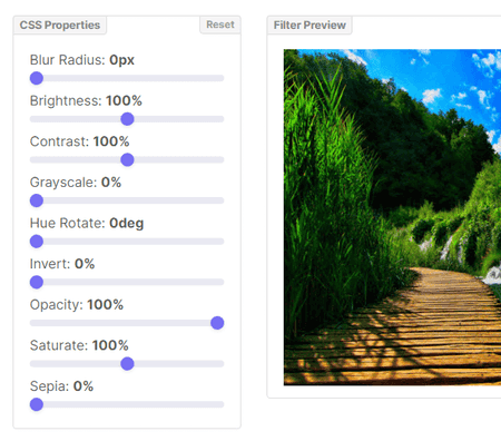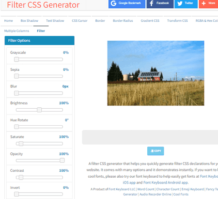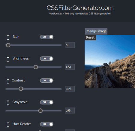這是另一個不錯的在線 CSS 圖像過濾器生成器網站,它提供了自定義 CSS 圖像過濾器和生成 CSS 圖像過濾器代碼所需的所有工具。