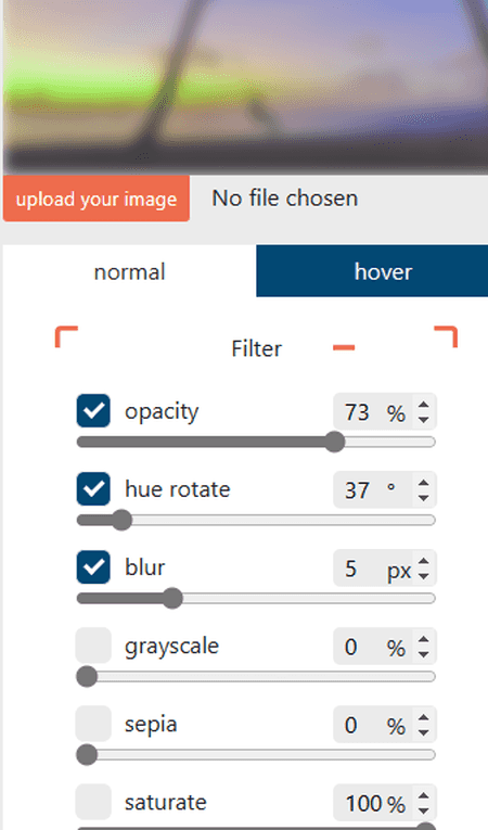 轉到該網站並打開“圖像過濾器”部分。之後,轉到正常和懸停部分並指定濾鏡參數,例如不透明度、模糊、反轉、模糊等屬性。現在,檢查示例圖像上生成的濾鏡的外觀。最後,從生成的 CSS 部分複制最終的 CSS 圖像過濾器代碼。