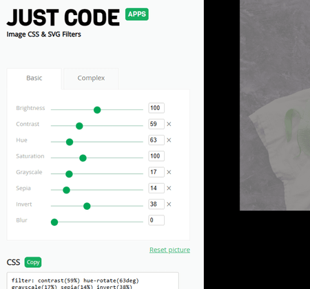 justcode.today 是另一個免費的在線 CSS 圖像過濾器生成器網站。通過這個網站,用戶可以創建 CSS & SVG 圖像過濾器代碼。該網站同時提供基本和復雜的圖像過濾器參數調整工具。通過基本部分,用戶可以調整基本濾鏡屬性,如亮度、對比度、色調、飽和度、模糊、反轉等。另一方面,複雜選項 允許用戶調整高級屬性,例如漸變映射、查找邊緣、閾值、著色 等。根據指定的濾鏡參數,它會顯示示例圖像的濾鏡效果以及CSS 和 HTML 用戶可以復製到剪貼板的代碼。現在,按照以下步驟操作。