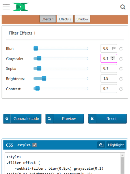 轉到該網站並訪問 CSS 濾鏡效果亮度對比度模糊工具。之後,使用 Effects 1、Effects 2 和 Shadow 滑塊 指定 CSS 圖像濾鏡外觀。現在,用戶可以調整背景圖像的顏色和強度。最後,預覽過濾器外觀,然後單擊生成代碼按鈕以查看最終的 CSS 圖像過濾器代碼。