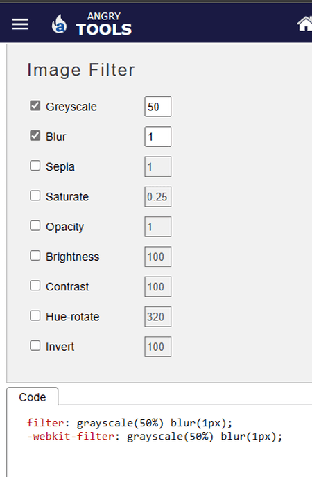 angrytools.com 是另一個免費的在線 CSS 圖像過濾器生成器網站。該網站提供了一個 CSS 生成器工具,該工具也可用於生成自定義 CSS 圖像過濾器。生成 CSS 圖像濾鏡的過程非常簡單,因為用戶只需手動指定濾鏡參數的強度,例如灰度、模糊、棕褐色、飽和度、亮度、色調旋轉、 Invert等。根據指定的濾鏡參數強度,它會生成一個圖像濾鏡,用戶可以在其界面上預覽。現在,按照以下步驟操作。
