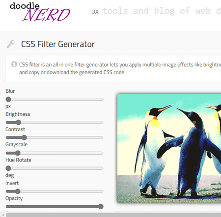 doodlenerd.com 是一個免費的在線 CSS 圖像過濾器生成器網站。通過該網站,用戶可以通過手動指定濾鏡參數強度(如 Blue、Brightness、Contrast、Invert、Opacity、Saturate 等)來創建自定義 CSS 圖像濾鏡。所有濾鏡參數的更改將反映在實時採樣圖像。完成濾鏡後,用戶可以復製本站生成的CSS圖片濾鏡代碼。現在,按照以下步驟操作。