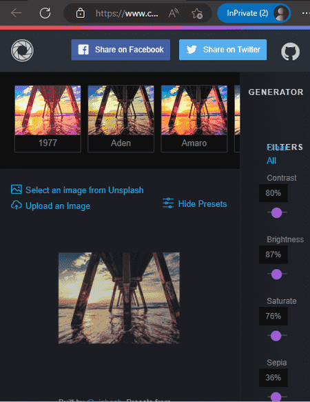 使用給定的鏈接轉到該網站。之後,選擇一個過濾器預設,如 1977、Aden、Amaro、Brannan 等。接下來,轉到生成器部分以增強現有過濾器或創建一個完整的過濾器使用可用滑塊的新自定義過濾器。現在,在示例圖像上預覽生成的過濾器的外觀。最後,轉到 CSS 代碼部分複制 CSS 圖像過濾器和標記代碼。