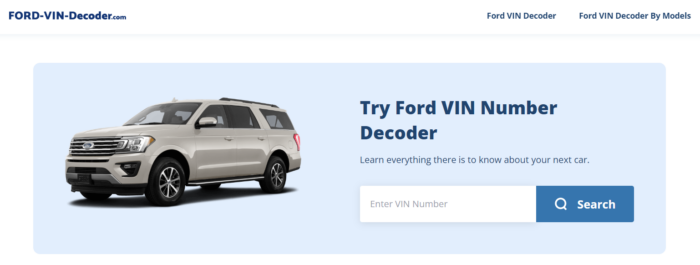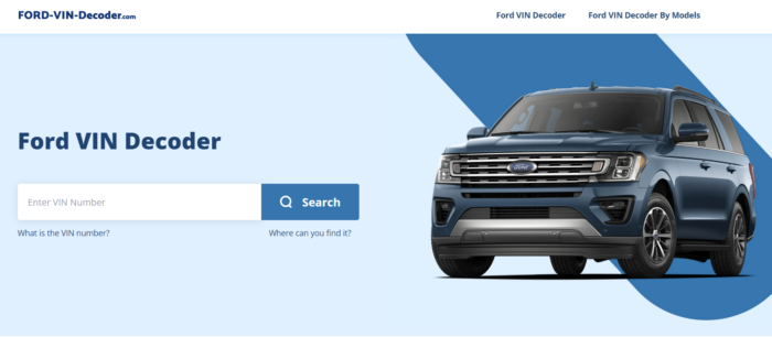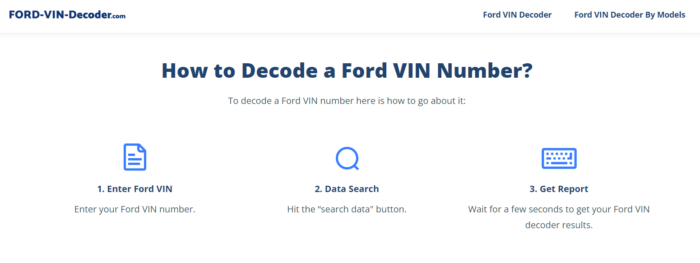 第 1 步:訪問 Ford-VIN-Decoder 的網站。在主頁上,您將看到福特 VIN 搜索引擎,您需要在其中輸入唯一的 17 位車輛標識符並點擊“搜索”。