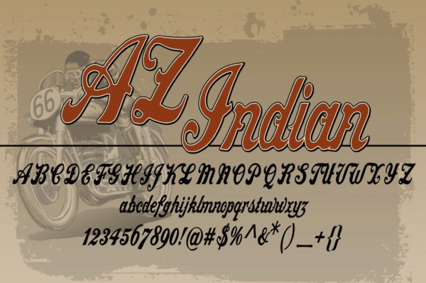 AZ Indian 是一種複古風格的字體,靈感來自 1900 年代初期的原始印度摩托車標誌。這種字體非常適合標題。您還可以將此字體用於徽標、海報、標題和其他用途。它只有 OTF 格式,看起來很獨特。這種字體非常適合各種設計項目,為項目增添魅力。