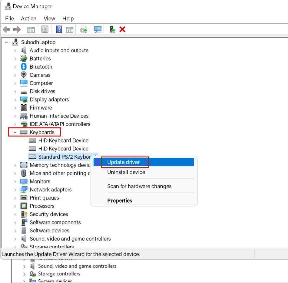 右鍵單擊連接的鍵盤。點擊更新驅動程序 > 選擇自動搜索驅動程序。系統將自動檢查可用的更新。如果有更新可用,它會自動下載並安裝最新版本。完成後,請確保重新啟動 PC 以應用更改。
