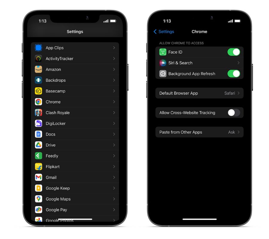 在您的 iPhone 上打開設置。導航到 Chrome。打開 Face ID/Touch ID 開關。