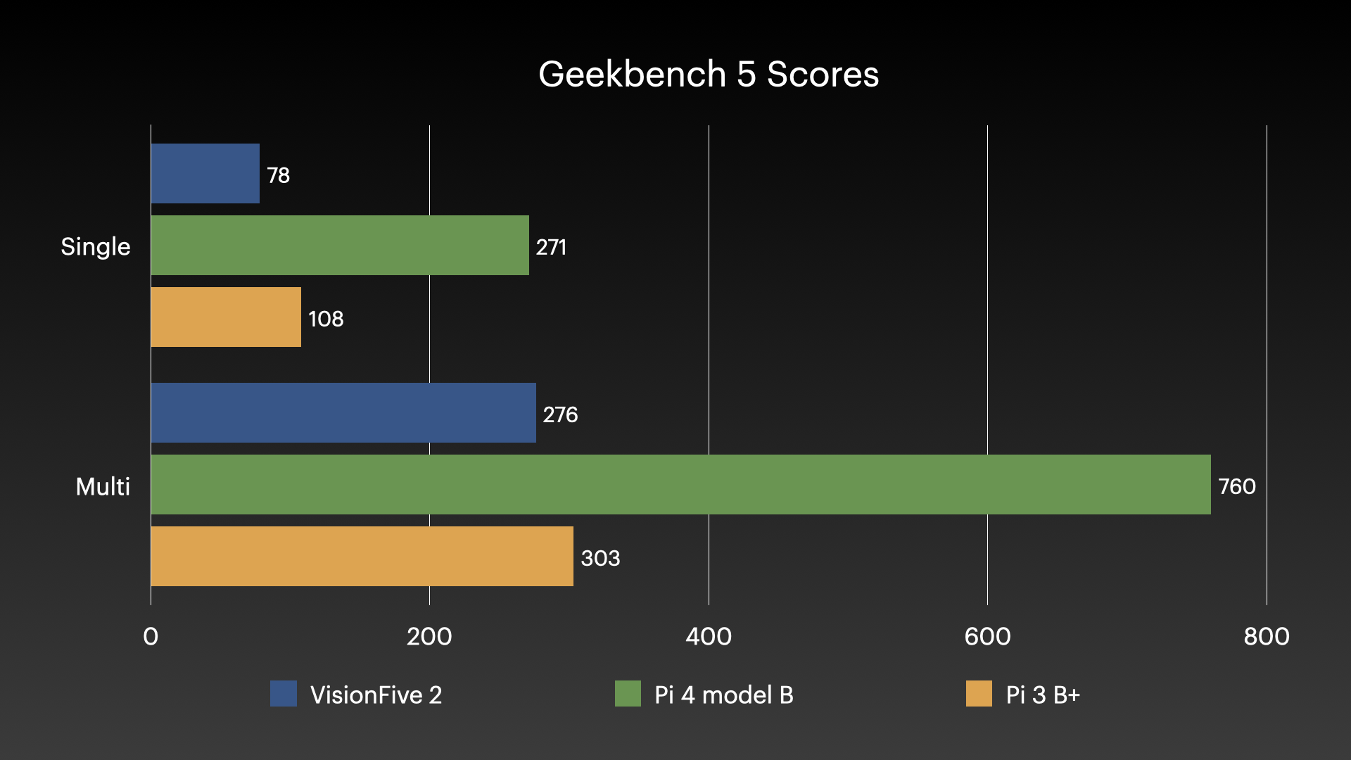 好吧,只要運行像 Geekbench 這樣的基本基準測試,VisionFive 2 的單核得分為 78,多核得分為 276。