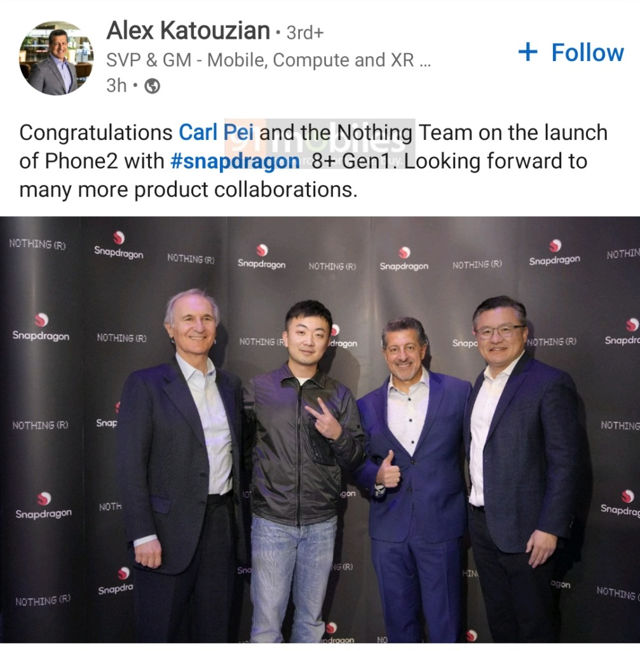 在 LinkedIn 上一篇現已編輯的帖子中,高通公司高級副總裁兼移動、計算機和 XR 業務總經理對 Nothing 表示祝賀推出 Nothing Phone (2)。看手機還沒上市的樣子,看來這篇帖子上得比預想的要早。同樣有趣的是,該帖子提到使用 Qualcomm Snapdragon 8+ Gen 1 的方式,該芯片組於 2022 年推出,是 Snapdragon 8 Gen 1 的變體。