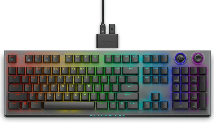 “我們全新的可編程翹板開關和轉盤讓您可以快速調整控制媒體,同時讓您專注於遊戲。現在,您可以輕而易舉地開始和停止您喜愛的音樂、跳過歌曲和調節音量,而無需第三方設備——您所需要的只是 Alienware Command Center。 Tri-Mode 無線遊戲鍵盤擁有超過 1 億次啟動,標配高精度、一流的 CHERRY MX Red 開關,可提供流暢的擊打,PBT 雙射鍵帽具有可靠的耐用性,每鍵 AlienFX RGB 照明允許讓您內心的遊戲玩家脫穎而出,防重影和 N 鍵翻轉實現精確控制。”