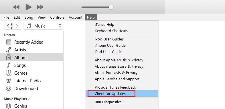 在您的計算機上啟動 iTunes 。現在,單擊菜單欄中的幫助。選擇檢查更新選項並按照提示進行操作。