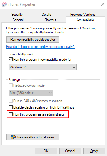 首先,右鍵單擊桌面上的 iTunes 。選擇屬性並轉到兼容性。尋找“以管理員身份運行此程序”並啟用它。
