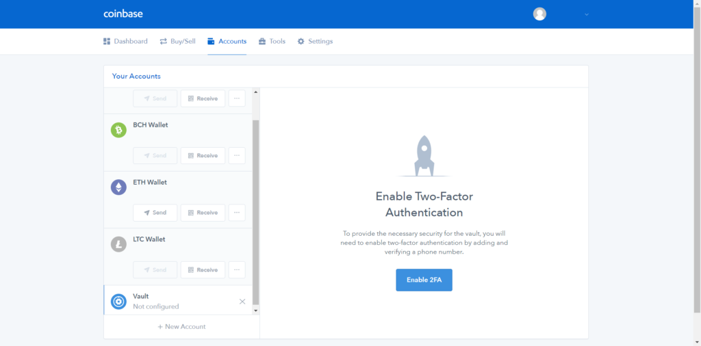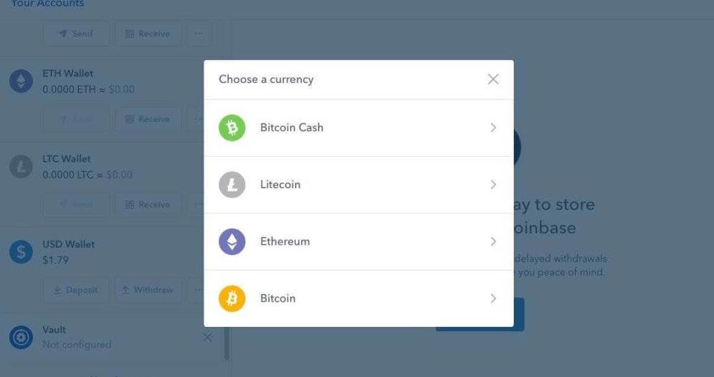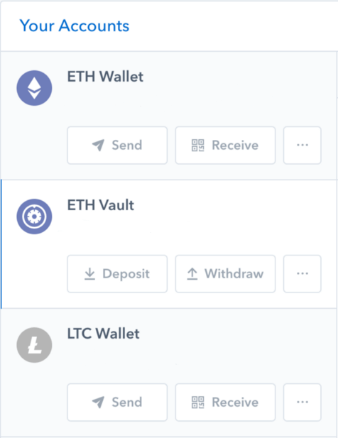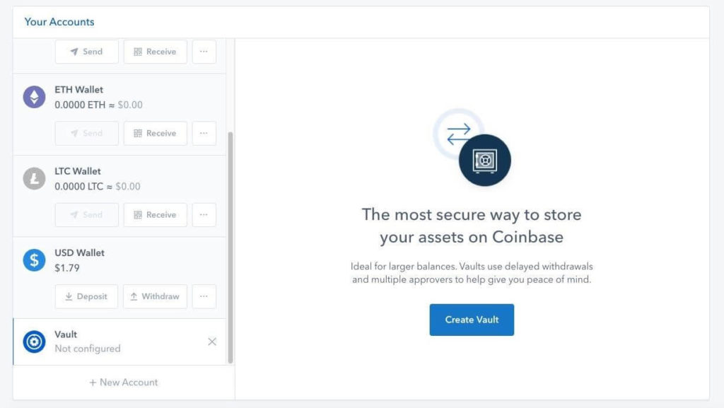 您可以存儲您的比特幣 (BTC)、萊特幣 (LTC) )、比特幣現金 (BCH) 和以太坊 (ETH) 在保險庫中,這些保險庫的工作方式與您的普通錢包(您在 Coinbase 上存儲加密貨幣的錢包)一樣,只是這些專用錢包需要不同程度的授權才能退出,以及您的資金釋放之前的一段固定時間,以防止立即取款。