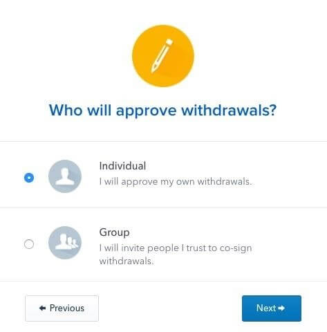 第 5 步:快完成了!為您的保險庫命名後,您現在需要選擇提取資金的方式。您可以選擇兩個選項:個人,您剛剛創建的用於存儲的保險庫僅需要您的授權才能提取保險庫中的資金。 組,其中您剛剛創建的保險庫需要您選擇作為共同簽名者的組成員的許可才能成功完成提款。 (把它想像成投票,大多數人投票退出,然後你就可以退出)。因此,選擇您想要的兩個選項中的一個,然後點擊下一步。