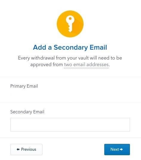 第 6 步: 如果您選擇個人,那麼 Coinbase 將只需要您的許可就可以提取金庫中的資金。您確實需要提供輔助電子郵件地址作為安全措施,以便在您決定從保險庫中提取資金時通知您。因此,在此頁面的此處輸入您的輔助電子郵件,然後點擊下一步。