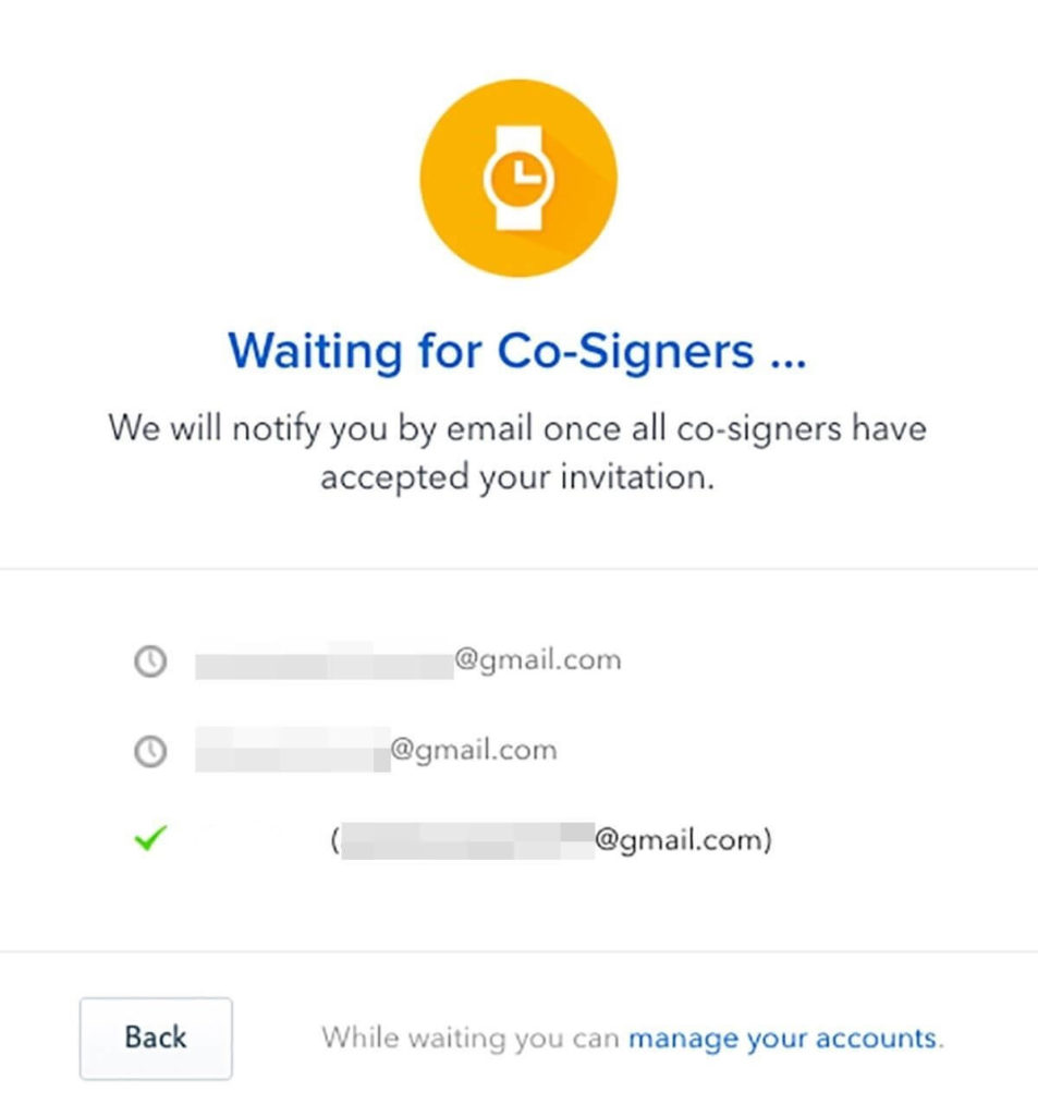 Coinbase 將要求您之前選擇的群組成員通過電子郵件確認來驗證您的提款,然後再將金庫中的資金發放給您。因此,由於您是賬戶持有人,只有您可以要求提款,但您需要獲得小組成員的多數票。