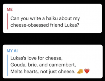 在這個看似武斷的例子中,關於一個名叫 Lukas 的人喜歡奶酪的俳句。為您提供有關如何將其用於濫用的所有信息。孩子們有時會對彼此相當殘忍。網絡欺凌和其他欺凌行為是許多年輕人生活中的不幸經歷。具有即時更改 AI 名稱的能力,然後該 AI 能夠發送一些關於可能聞到的人或您能想像到的任​​何東西的意思。很難不看到這只能以淚水告終。