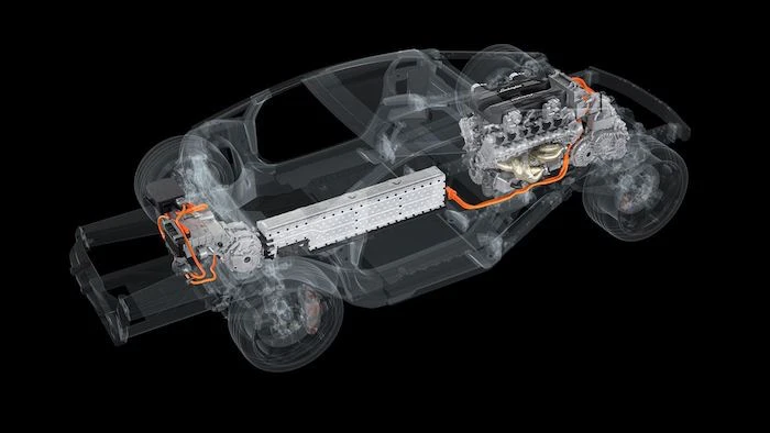 該車展示了前所未有的佈局:自然吸氣的 6.5 升 V12 中置發動機輔以三個電動機,其中一個集成到新的雙離合器八速變速箱中。它橫向安裝並首次放置在內燃機後面。在自 Countach 時代以來一直是傳動隧道的地方,取而代之的是鋰離子電池,它為電動機提供動力。