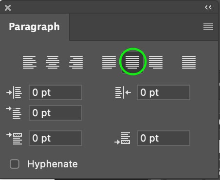 在段落面板的選項中單擊名為Justified Last Centered的段落樣式。