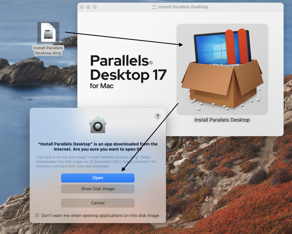 之後,雙擊下載的.dmg文件,然後雙擊安裝Parallels Desktop 在打開的窗口中,如果需要管理員確認才能繼續,然後選擇打開。