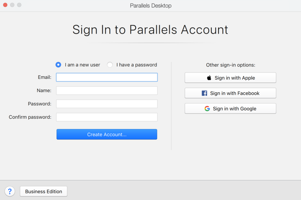 一切準備就緒後,單擊創建,然後單擊繼續開始安裝。很快,VM 將創建並在您的屏幕上打開。在開始使用之前,您需要創建一個 Parallels 帳戶。您還可以使用您的 Google 或 Facebook 帳戶或您的 Apple ID 登錄。登錄後,虛擬機將打開,您就可以開始使用它了。