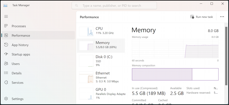 點擊“性能”在左邊,還有一整套“另一組圖形表示,也就是計算機上正在發生的事情,比性能監視器中那個笨拙的線圖更有吸引力。我將檢查“內存”,儘管您可以查看 CPU、內存、磁盤、以太網和 GPU: