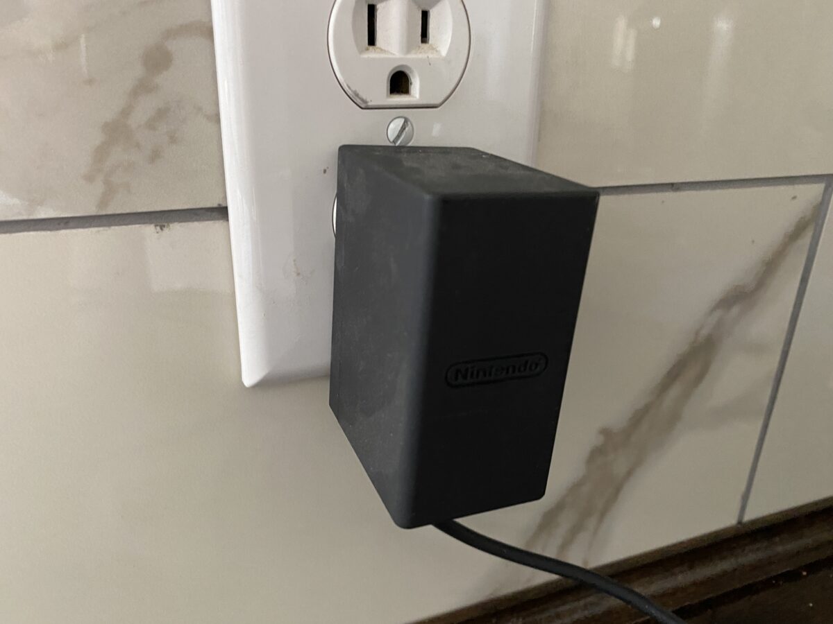接下來,您需要將 Switch 充電器插入牆上插座。這將提供比使用帶有標準電話適配器的普通 USB-C 數據線快得多的充電速度。此外,如果可能,您應該將充電器的電源插入電湧保護器以保護控制台。