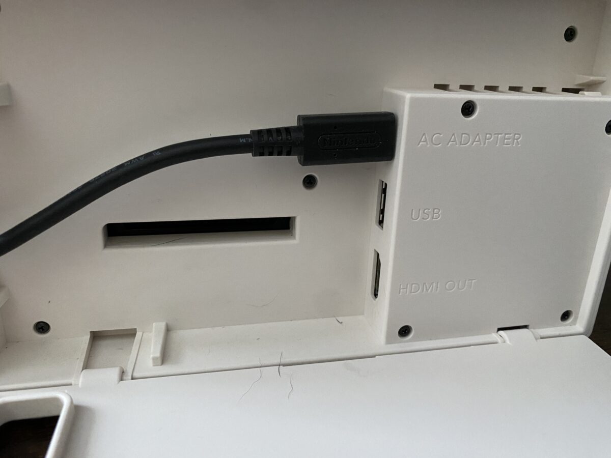 現在是討論擴展塢充電的好時機。它與原裝 Switch 和 Switch OLED 兼容。您無需將充電器插入 Switch,而是需要將其插入隱藏在背面翻蓋後面的底座充電端口。插入電源後,繼續將 Switch 滑入底座以開始充電。