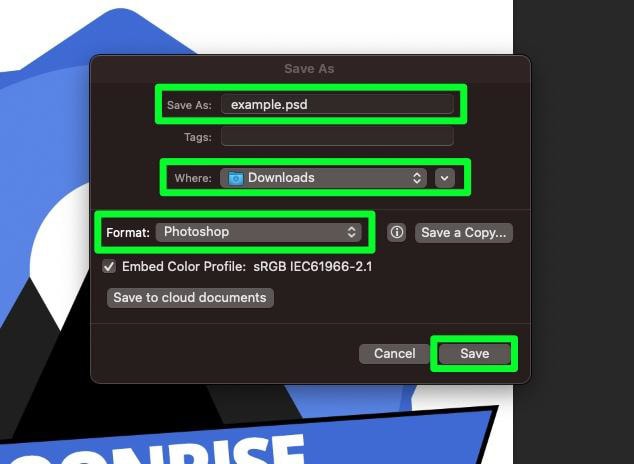 在另存為框中,為您的文件命名。在位置框中,選擇您的目的地。在格式下拉菜單中,選擇Photoshop選項。