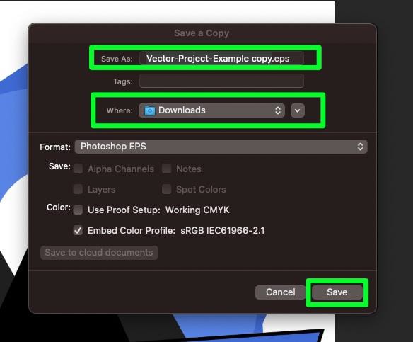 您會在保存副本的中間找到格式下拉菜單強>選項菜單。從此菜單中選擇 Photoshop EPS。