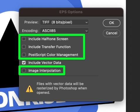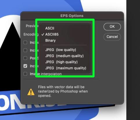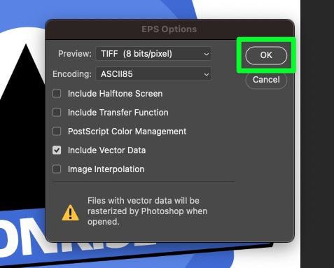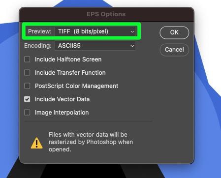 如果您想稍後在 Photoshop 中處理 EPS 文件,這裡的大問題是光柵化。如果你在 Photoshop 中打開一個 EPS 文件,所有的矢量數據都會被光柵化,這使得打開文件變得毫無意義。