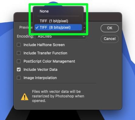 無 – 如果您不需要任何預覽圖像,請選擇此選項。這是限製文件大小的好方法。 TIFF(1 位/像素) – 此選項將創建包含較少信息的黑白預覽圖像,這意味著文件大小小於下一個選項。 TIFF(8 位/像素) – 此選項為您提供預覽圖像的全彩色版本。這是最好看的預覽圖像,但會向您的文件添加最多的數據,從而導致文件更大。