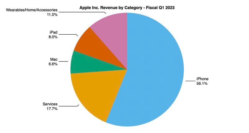 在產品類別方面,iPhone 同比下降 8%。 Mac 收入下降至 77.4 億美元,而去年同期的收入為 108.5 億美元。雖然 iPad 的收入增長了 30%,但可穿戴設備、家庭和配件類別同比下降了 8%。這是一張圖表,描述了每個類別對本季度收入的貢獻: