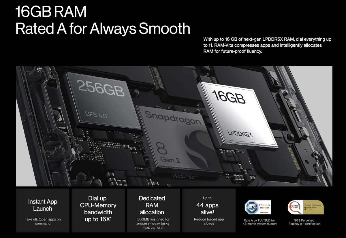 5G Android 手機配備了最新的旗艦級高通芯片組( Snapdragon 8 Gen 2)、最新的 RAM 技術(LPDDR5X)、最新的存儲技術(UFS 4.0)以及一大堆功能大多數手機用戶想要的-5,000mAh 電池、快速充電(100W,根據此處預訂頁面上提供的圖片)和 IP64 防塵防水等級。它還提供高達 Wi-Fi 7 的兼容性,但(目前)要找到 Wi-Fi 7 路由器來利用它並不容易。