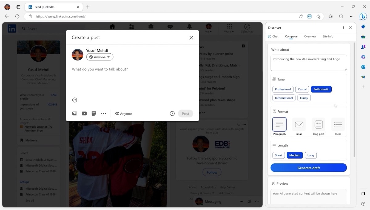除了新的Bing,Microsoft 正在為其 Edge 瀏覽器推出兩項新的 AI 增強功能 Chat 和 Compose。這些將嵌入到 Edge 的側邊欄中,因此您可以要求它執行諸如撰寫文本、電子郵件、社交媒體帖子等任務。之後,您可以要求它幫助您更新帖子的語氣、格式和長度。 Edge 可以理解您所在的網頁並相應地進行調整。