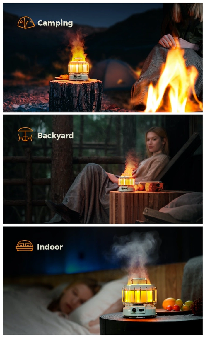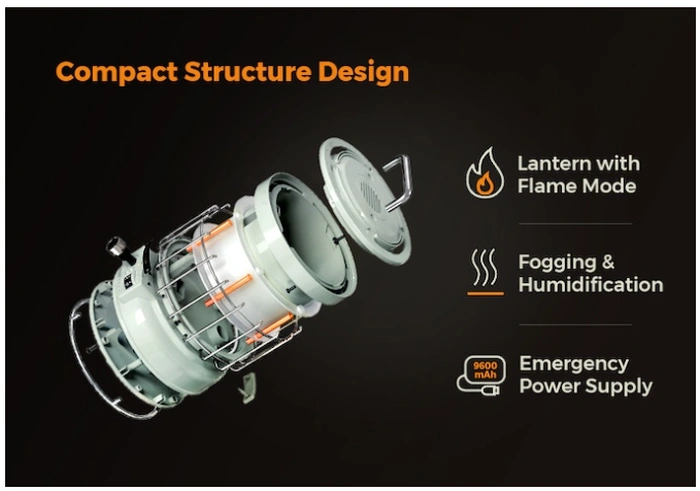 “結合光、影、霧,通過燈光營造逼真的火焰效果。微風吹來,火焰效果隨風搖曳,在夜晚帶來浪漫治癒的氛圍。安全溫暖,隨時隨地燃燒。 MAX LANTERN 可單獨用作加濕器。當室外或室內環境乾燥時,只需將 100 毫升水倒入頂部進水口並將開關滑動到加濕模式。為您帶來更舒適的體驗。”