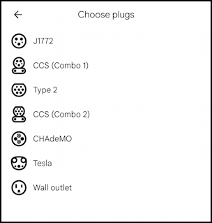 此時,您會看到一個屏幕,您可以在該屏幕上指定可以為車輛充電的插頭。這些將完全取決於適用於您車輛的充電線:
